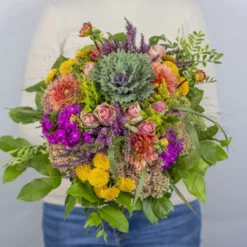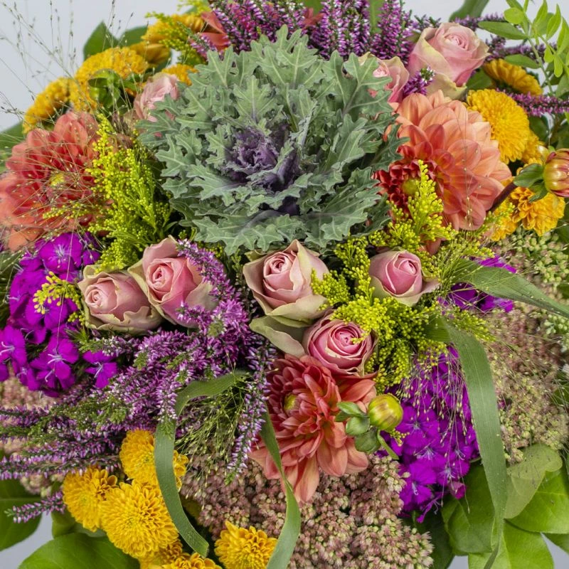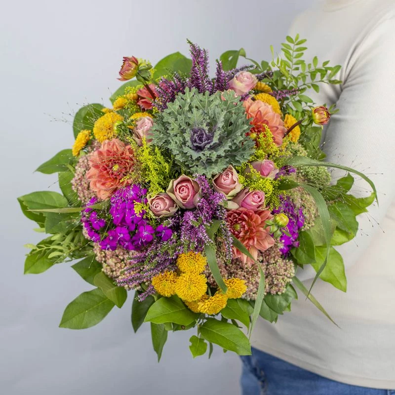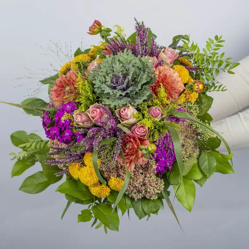 Der Herbststrauß „Autumn Leaves“ macht mit rosafarbenen Linssen-Rosen, orangenen Dahlien und Zierkohl sowie Santini, Bartnelken und lockerer Hirse Lust auf den Herbst. Abgerundet wird der Strauß durch saisonales Beiwerk und natürlich frisch auf Bestellung handgebunden und sicher verpackt.