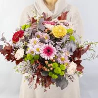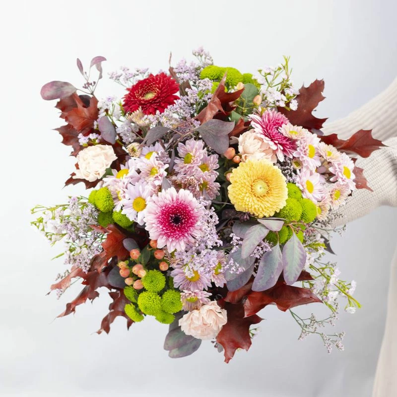 Der Herbststrauss „Felix“ überzeugt durch seine Leichtigkeit, welche durch verschiedenfarbige Mini-Gerbera, frischen Nelken in apricot, Chrysanthemen-Santini und Wachsflower entsteht. Ergänzt wird die Blütenpracht durch passendes Beiwerk der Saison. Der Strauß wird frisch auf Bestellung handgebunden und sicher auf die Reise geschickt.