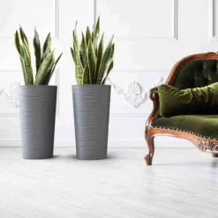 <UL> <LI>Kunststoff in Rillenoptik <LI>mit schwarzem Kunststoffeinsatz <LI>Farbe: graphit <LI>Maße: Ø30xH57cm</LI></UL>