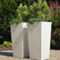 <UL> <LI>Kunststoff in Rillenoptik <LI>mit schwarzem Kunststoffeinsatz <LI>Farbe: weiss <LI>Maße: 25x25x46,5cm</LI></UL>